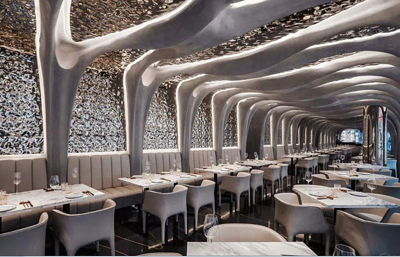 从远处看CASA TALIA西餐厅装修设计的风格就会被他所吸引,它就像一团棉花飘在空中,柔软轻盈,给人想要一探究竟的冲动。CASA TALIA西餐厅内更是给人不一样的视觉震撼,设计师用大海波浪的造型装饰其中,层层延伸,让整个空间都充满着时空感。星星点点的光源设计,就像一片星海,让顾客在这缥缈灵动的空间内吃饭,是一件多么浪漫的事啊!